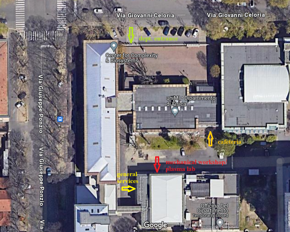 You can find the plasma laboratory in the big hall inside the courtyard of the physics department. Get to the big gate with glass windows – you will be looking into the machine workhop and the lab is also there. At the right side of the gate there is a bell, ring it and a bearded figure will come out of the lab to welcome you. In case of difficulties just go round the corner to the office “Servizi generali” (general services) and ask for Giancarlo Maero.